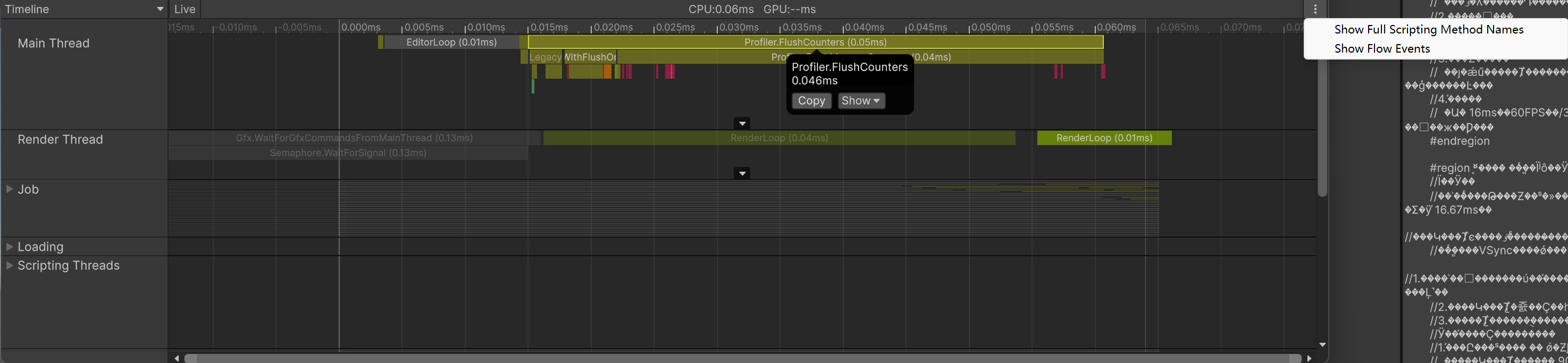 Show Full Scripting Method Names:显示完整的脚本方法名称Show Flow Events:显示线程间异步任务的调用路径(比如 Job 与 Main Thread 的联系线)