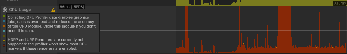 - 在使用 URP(通用渲染管线)或 HDRP(高清渲染管线)时,GPU 模块不会显示详细的 GPU 时间采样(比如各个 pass、shader 的耗时),所以数据不完整