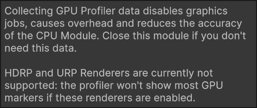 - 在使用 URP(通用渲染管线)或 HDRP(高清渲染管线)时,GPU 模块不会显示详细的 GPU 时间采样(比如各个 pass、shader 的耗时),所以数据不完整
