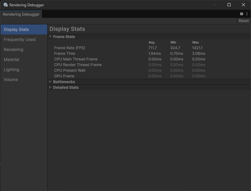 - 对于 SRP(URP/HDRP)我们可以使用 Rendering Debugger 进行性能检测(以后再讲 URP 相关内容时再展开)。