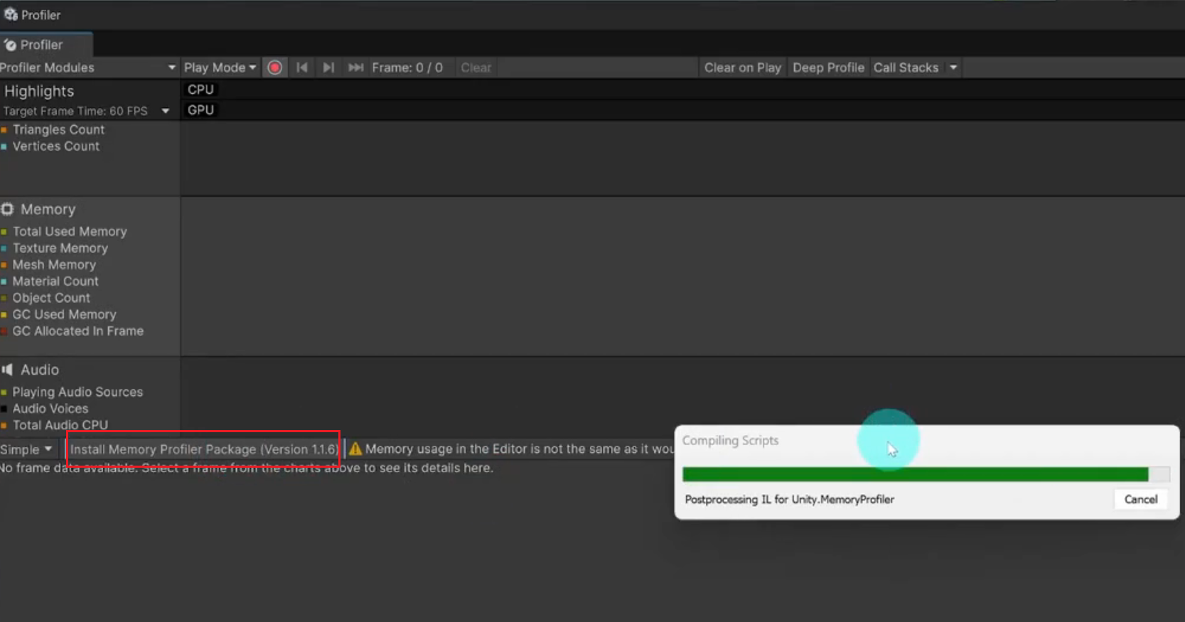 打开 Profiler 窗口并选择 Memory 模块,可以看到安装按钮。安装完成后点击 Open Memory Profiler,就会弹出 Memory Profiler 窗口。