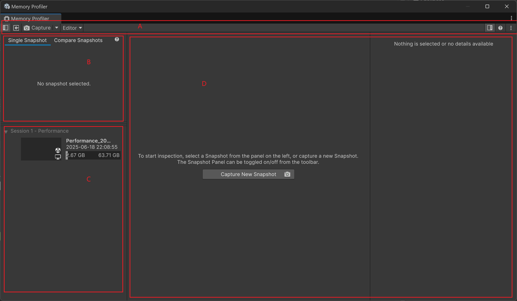 A:顶部菜单B:当前选中内存快照(Single Snapshot / Compare Snapshots 的入口区域)C:内存快照列表。每获取一次快照,这里会新增一条快照记录D:快照详情区。没有选择快照时,中间会出现Capture New Snapshot(捕获新快照)按钮