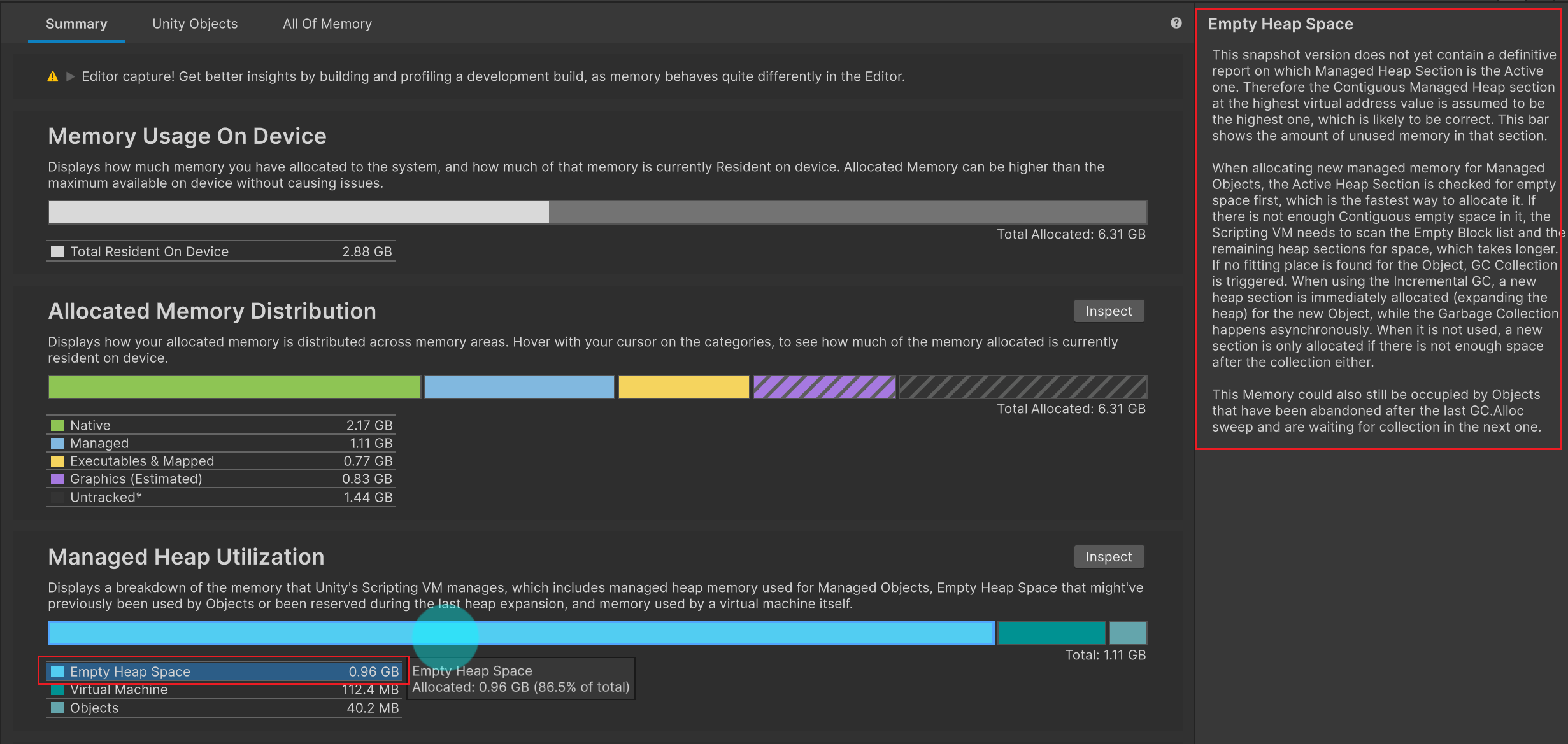 - Memory Profiler 会分析整个 Unity 进程中已分配和常驻(resident)的内存区域