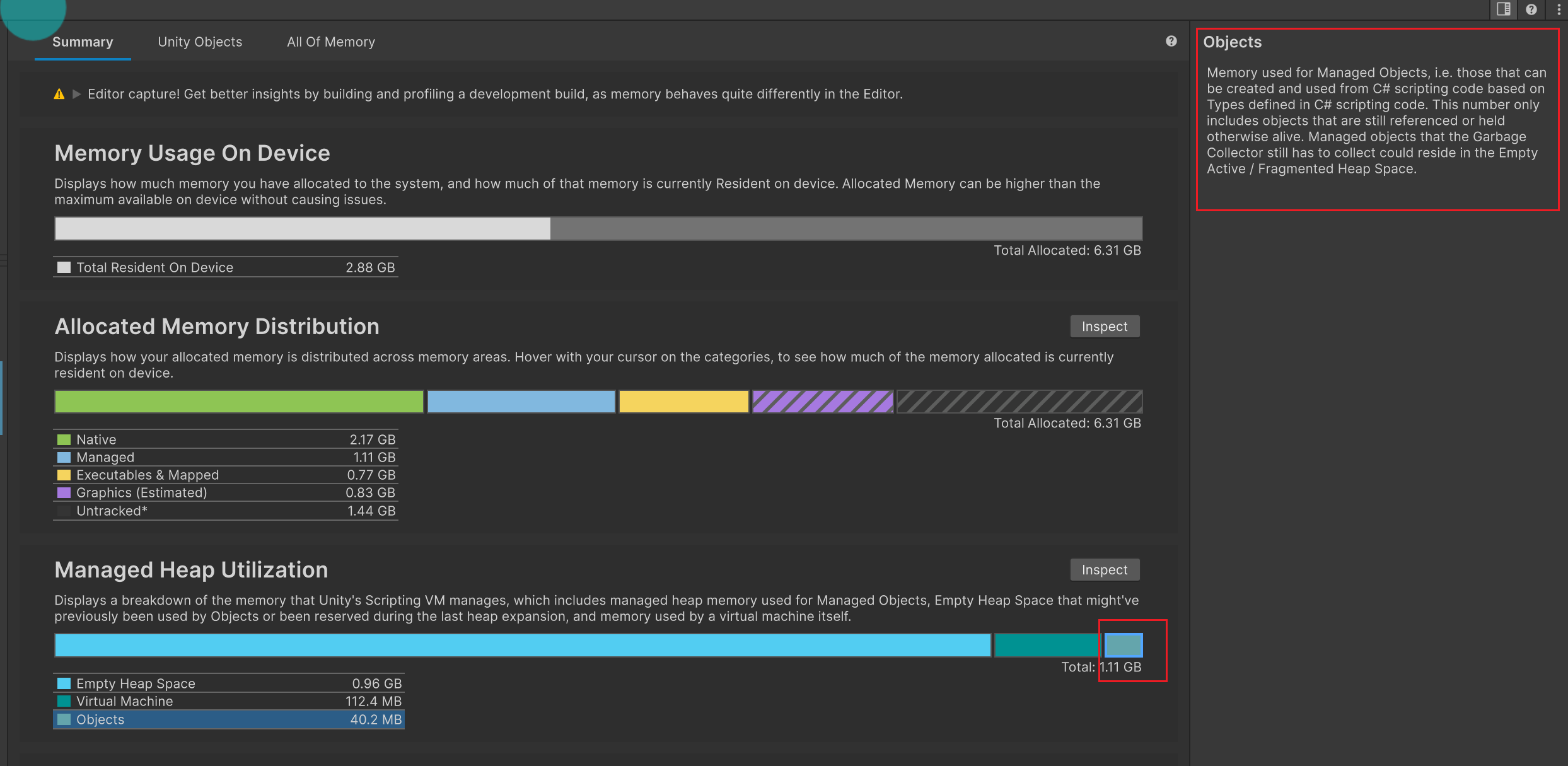Unity Objects标签页查看 Unity 对象的总内存使用情况 - 此外,并非所有此类资源的内存都实际存在于 GPU 中