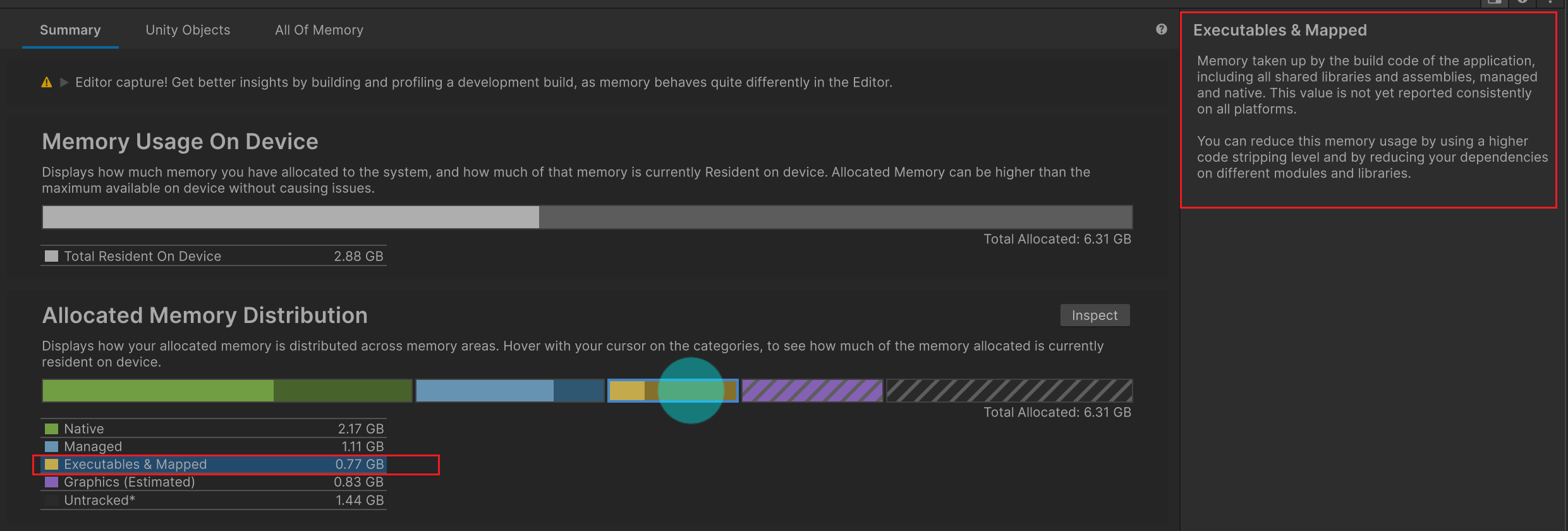 List等托管对象;如果过高,排查是否存在内存泄漏、GC 压力大等问题 - Executables & Mapped(可执行文件和映射内存):可执行代码和库;如果过高,说明项目模块太多,建议开启代码裁剪(Stripping Level)