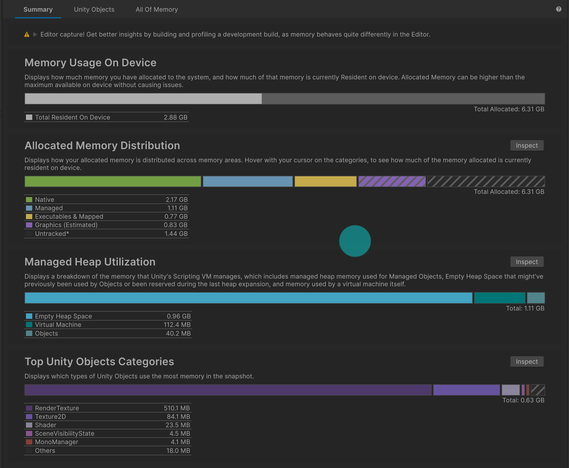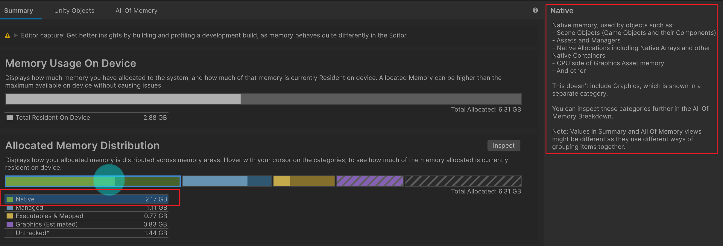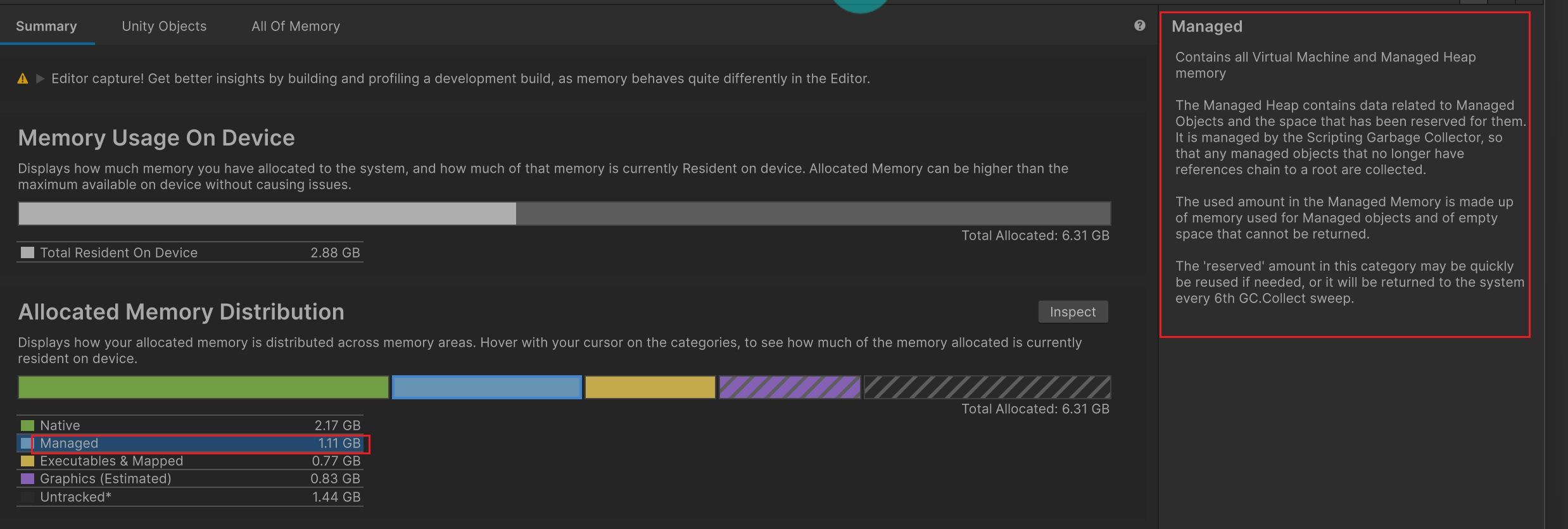 - Memory Profiler 会分析整个 Unity 进程中已分配和常驻(resident)的内存区域