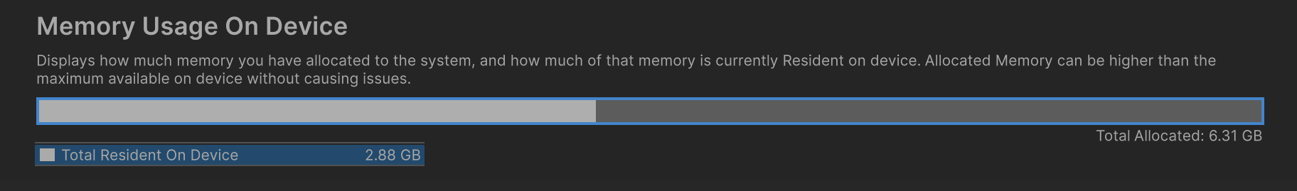 显示您已分配给系统的内存量,以及设备上当前驻留的内存量。分配的内存可以高于设备上可用的最大内存,而不会造成问题。
