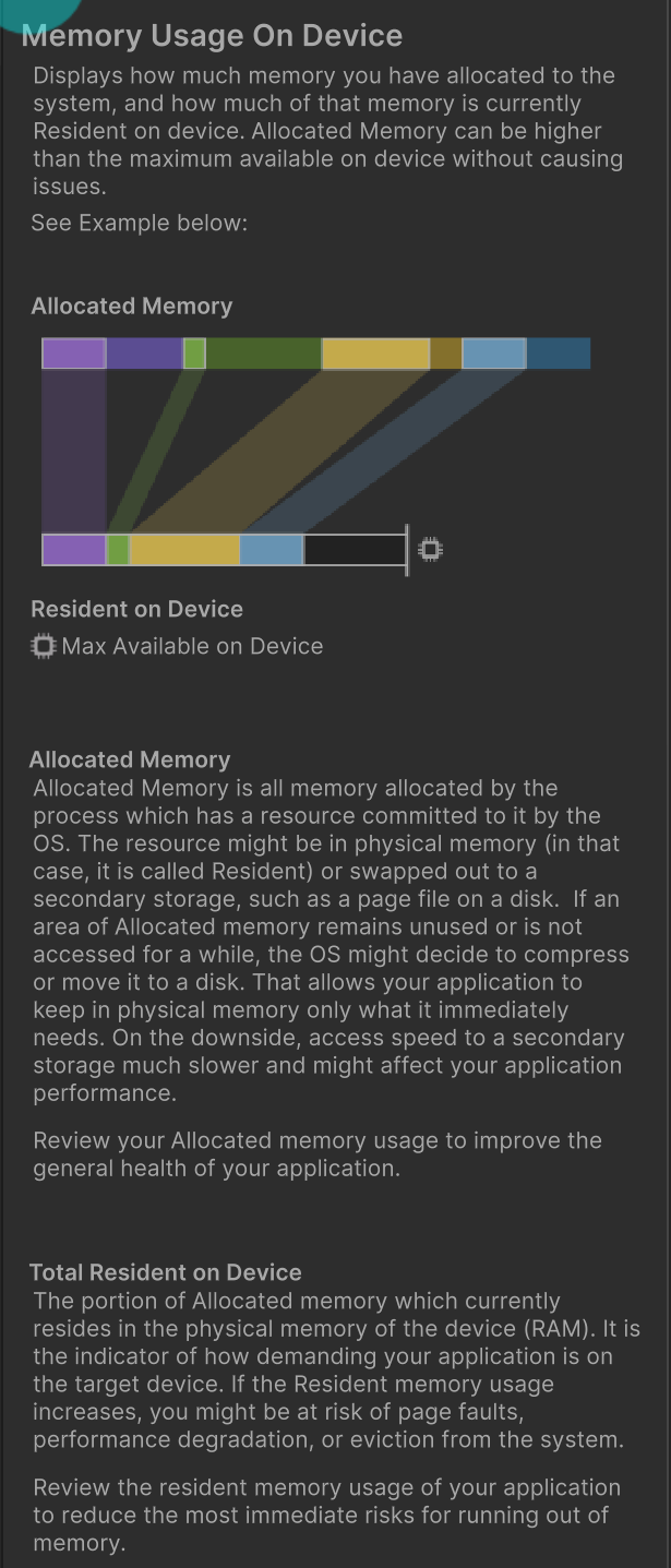 Resident Memory(常驻内存)或Allocated and Resident(分配和常驻)模式 - 如果遇到 Untracked 非常大:建议结合平台原生工具(如 Xcode Instruments 的 VM Tracker、Android 的 meminfo)进一步排查