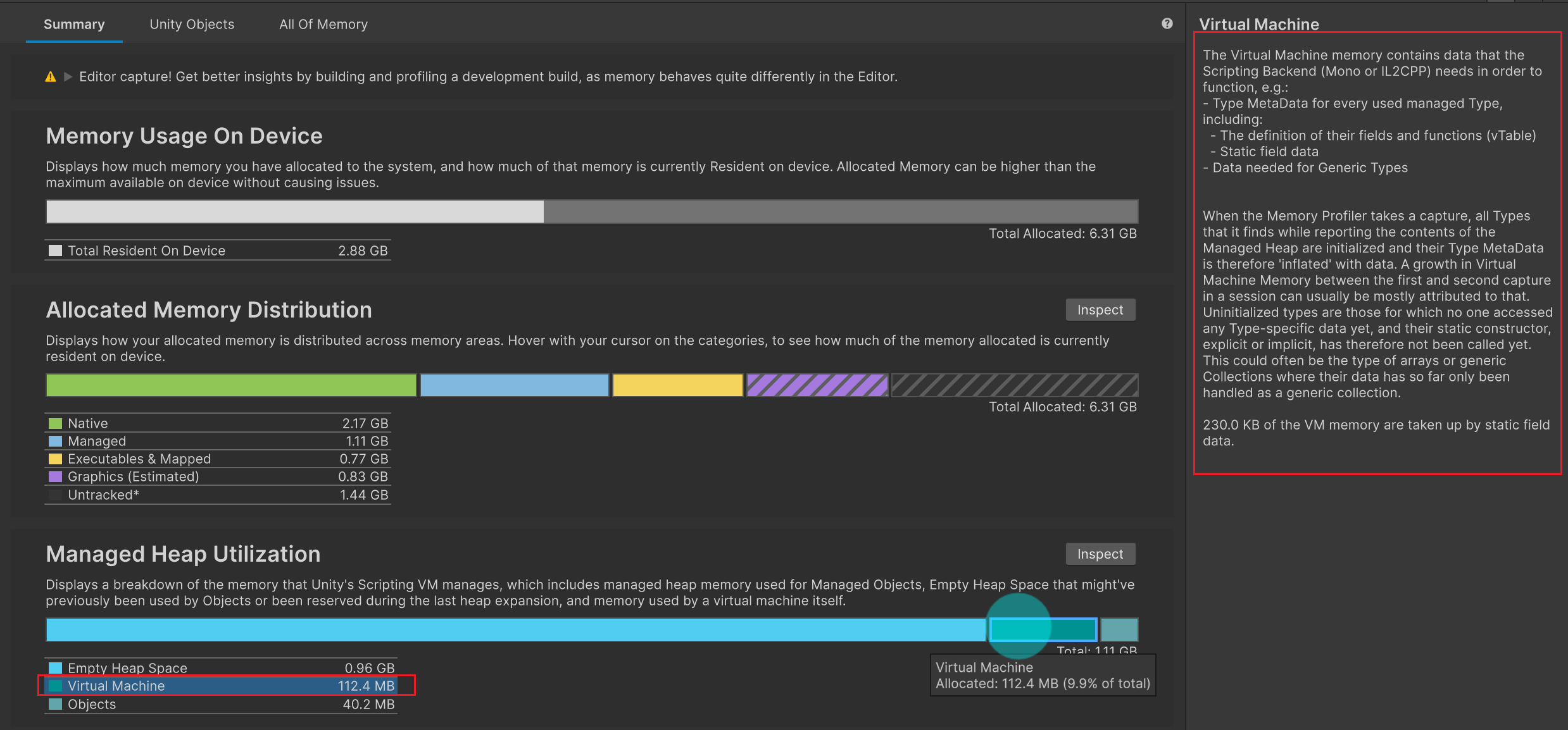 - 展示当前快照中,Unity 在设备上实际占用了多少内存