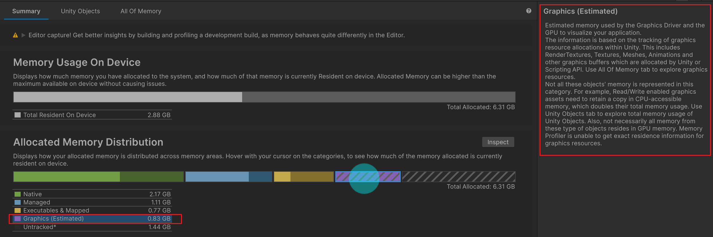 Unity Objects标签页查看 Unity 对象的总内存使用情况 - 此外,并非所有此类资源的内存都实际存在于 GPU 中