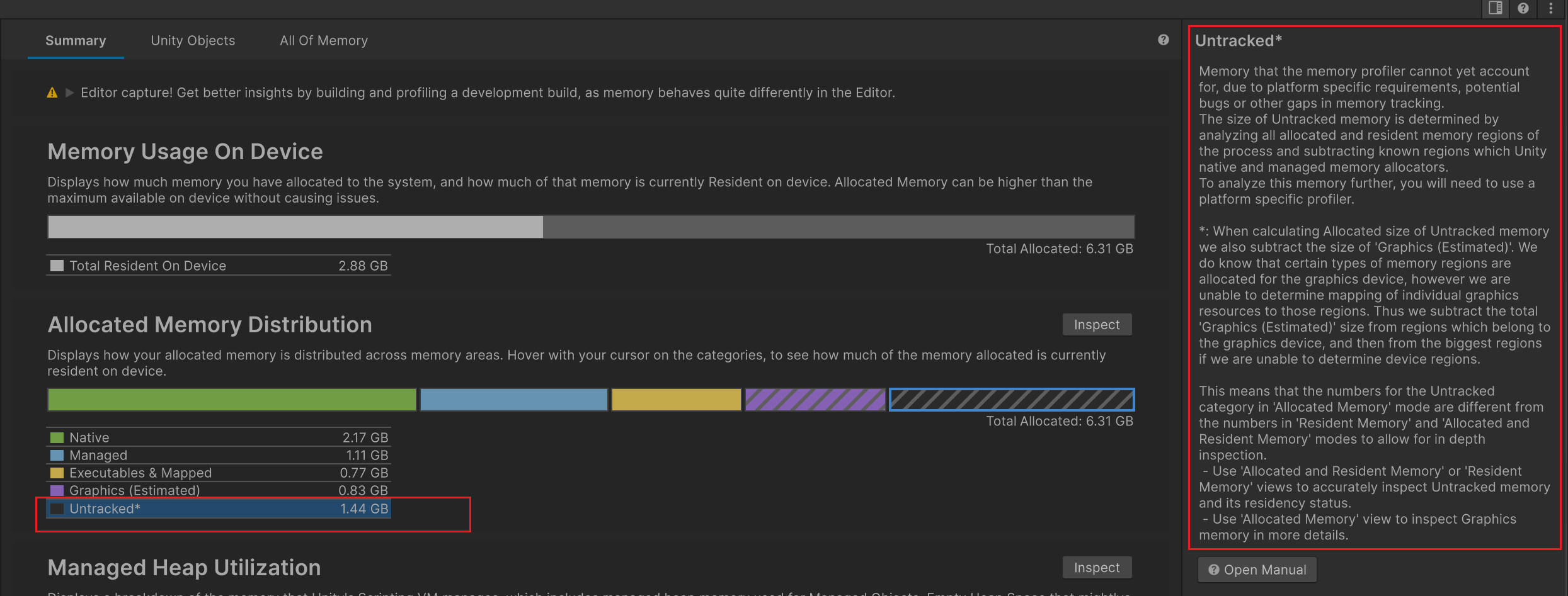 - Untracked*(未追踪的内存):Unity 无法识别的内存;若很大,可能是图形驱动、插件、平台相关等,需要用平台专用工具查看(如 Android Profiler、Xcode Instruments)