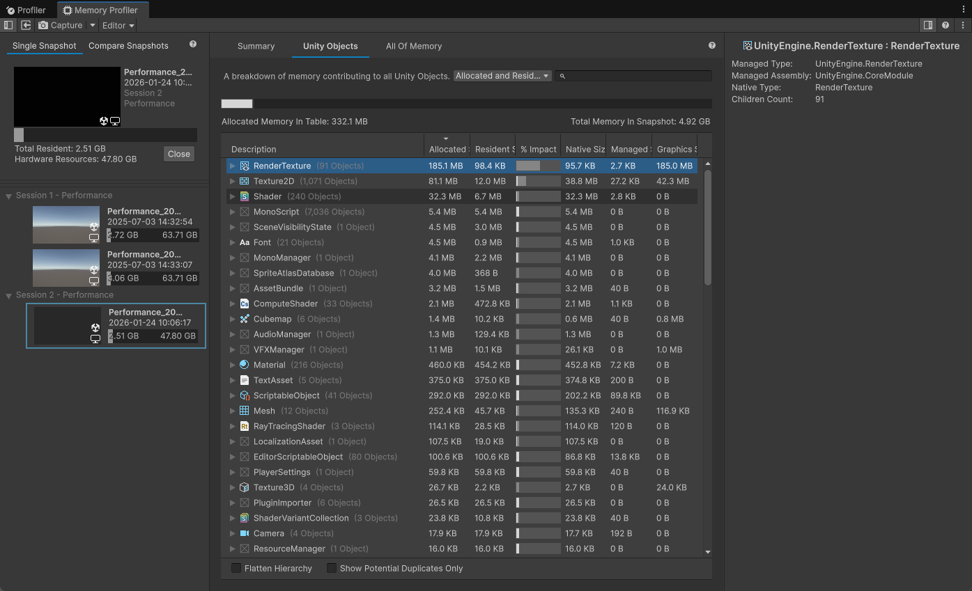 这个页签的核心能力:快速定位 Unity 对象内存占用的类型与具体实例。常见用途: