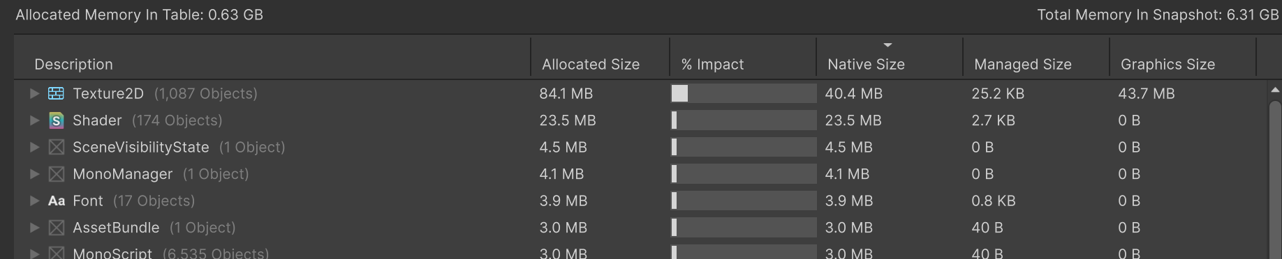 - Native Size:对象在 Unity 原生内存(C++ 层)中分配的大小(纹理、材质、网格这类通常主要在这里)