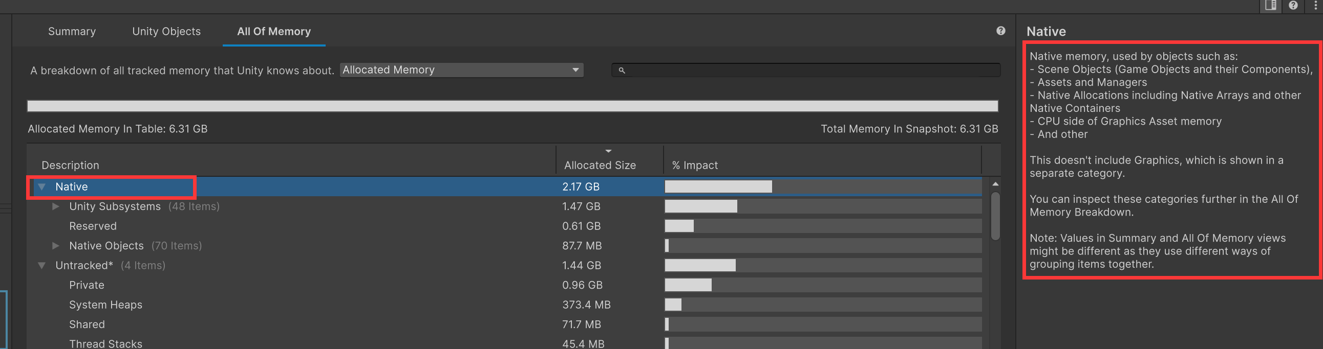 Resident Memory(常驻内存)或Allocated and Resident(分配和常驻) - 如果你遇到 Untracked 非常大 → 建议结合平台原生工具(如 Xcode Instruments 的 VM Tracker、Android 的 meminfo)进一步排查