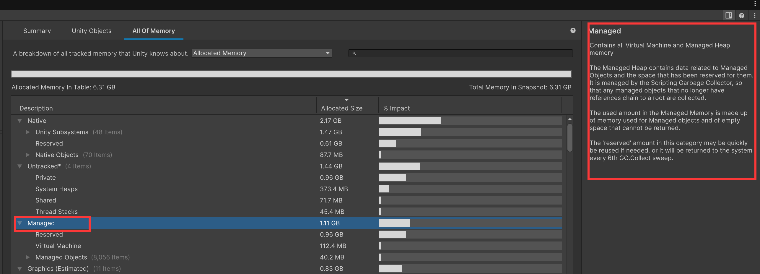 但如果你在快照中观察到“预留内存”值很高,大概率是由内存碎片化引起的:当内存碎片化时,某些小对象还残留在一个块中,从而导致整个内存块不能被回收,Unity 仍然保留它。