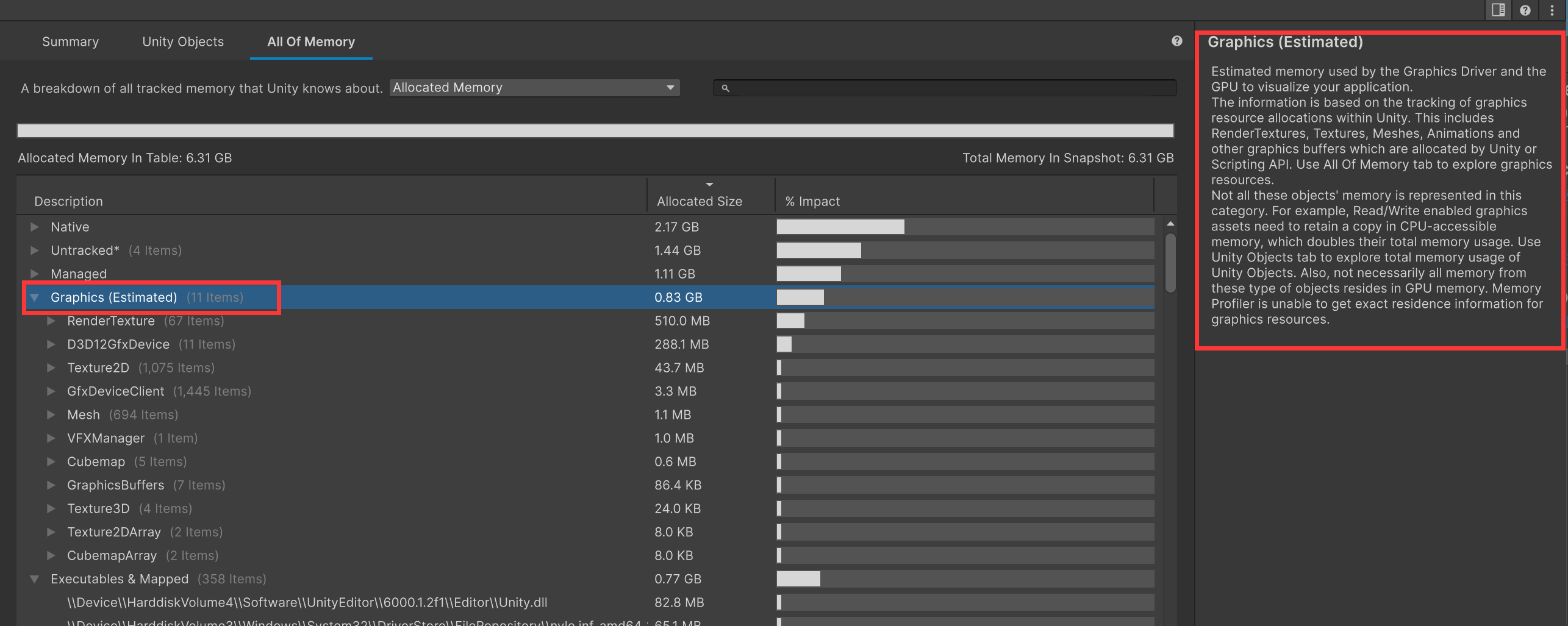 另外,并不是所有这类对象的内存都一定实际驻留在 GPU 中。Memory Profiler 无法准确获取图形资源是否实际驻留在 GPU 内存中的信息,因此这里只能提供估算值。