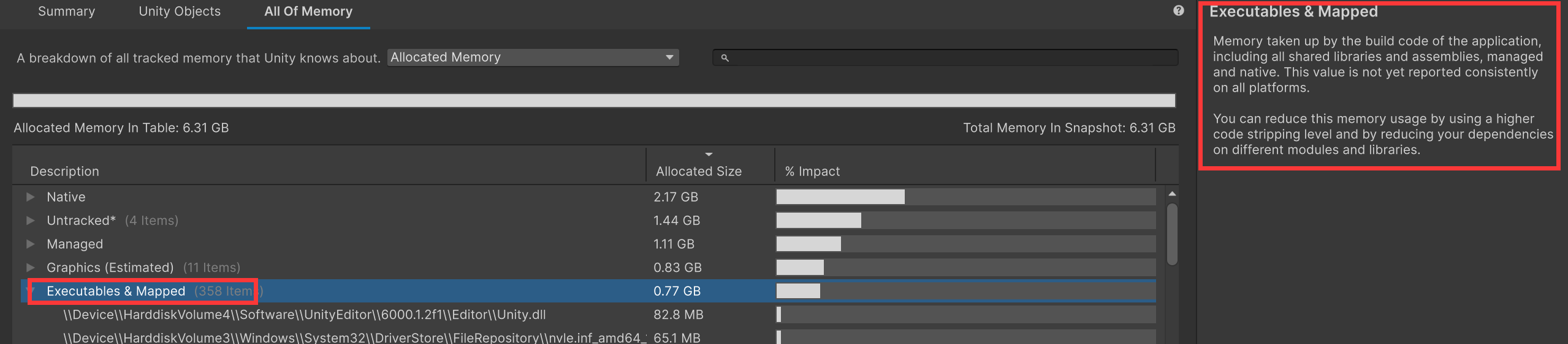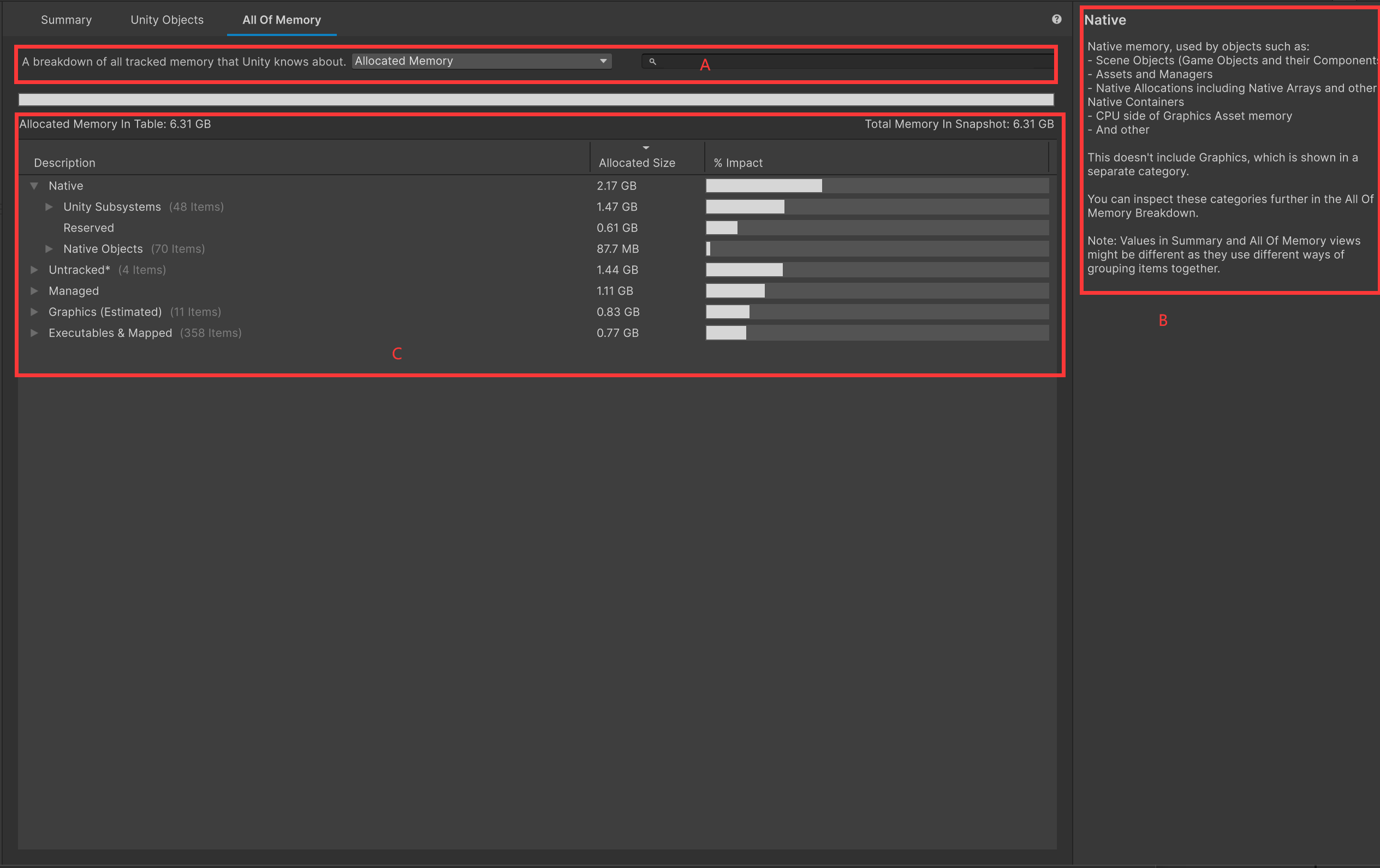 - Memory Profiler 会分析整个 Unity 进程中已分配和常驻(resident)的内存区域