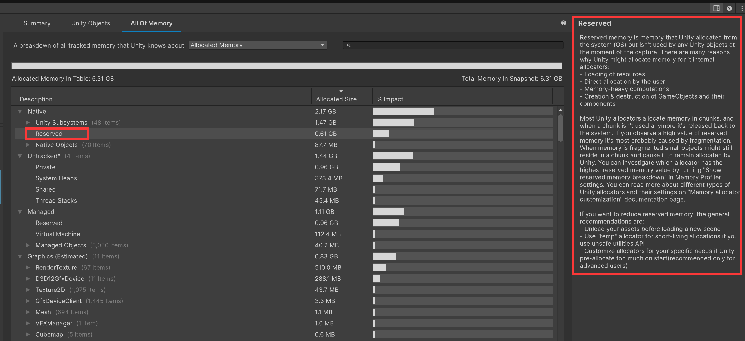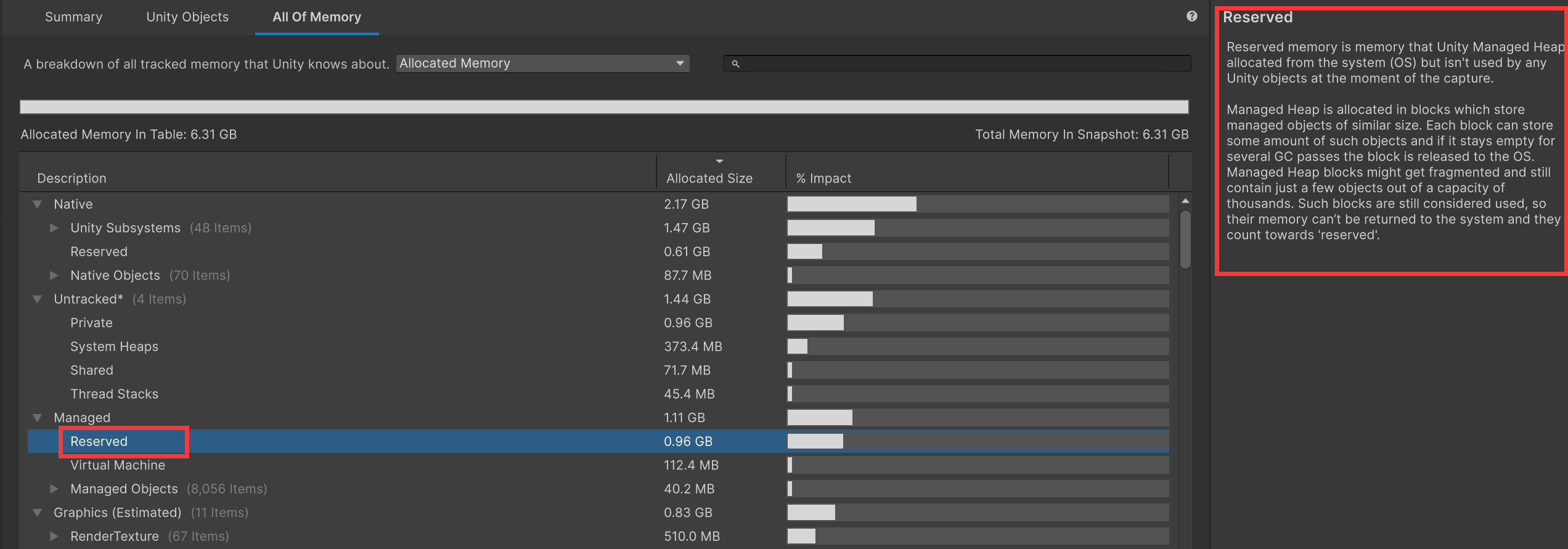 但如果你在快照中观察到“预留内存”值很高,大概率是由内存碎片化引起的:当内存碎片化时,某些小对象还残留在一个块中,从而导致整个内存块不能被回收,Unity 仍然保留它。