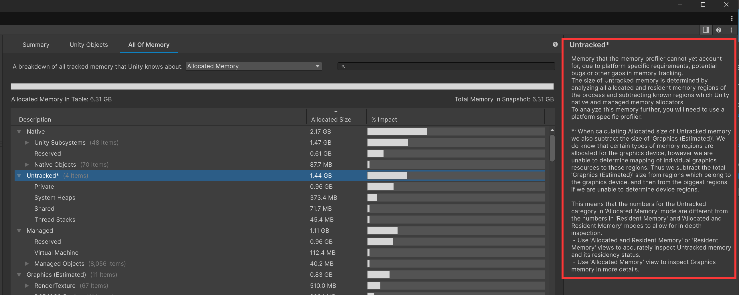 Resident Memory(常驻内存)或Allocated and Resident(分配和常驻) - 如果你遇到 Untracked 非常大 → 建议结合平台原生工具(如 Xcode Instruments 的 VM Tracker、Android 的 meminfo)进一步排查