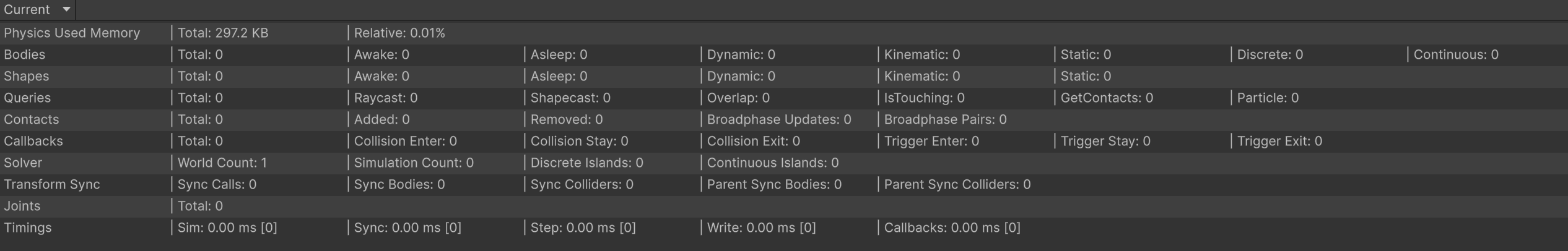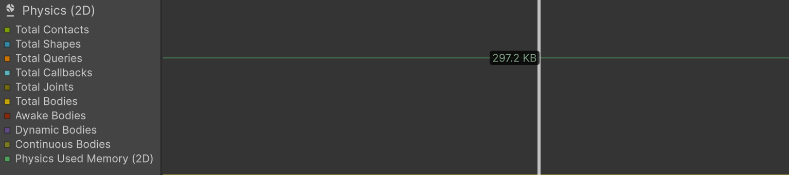 - **Physics Used Memory (2D)**:2D 物理系统使用的总内存。包括所有刚体、碰撞器、关节、缓存等 Box2D 系统占用的内存。可用于分析是否有未释放的资源或超大结构