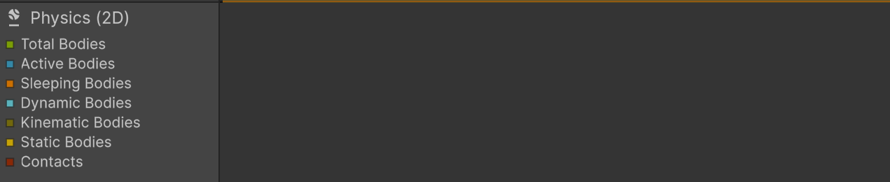 - Total Bodies:刚体总数。场景中所有的 Rigidbody2D 数量,无论状态(活跃/休眠/动态/静态)