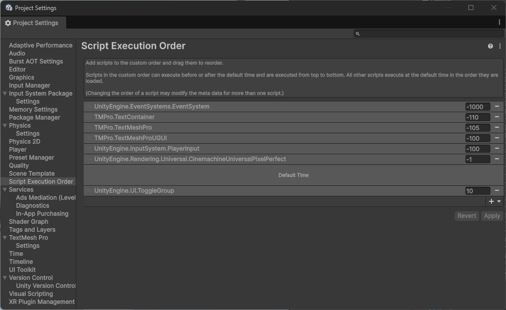 需要自定义执行顺序时,可在 Project Settings → Script Execution Order 中设置:将脚本加入自定义顺序列表,通过数值控制是在默认时间之前还是之后执行(负值更早、正值更晚),从上到下依次执行。