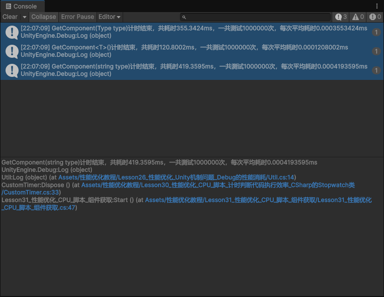 控制台输出会类似:泛型方式总耗时明显小于 Type 和 string 方式,说明优先使用 GetComponent<T>() 能带来性能提升。