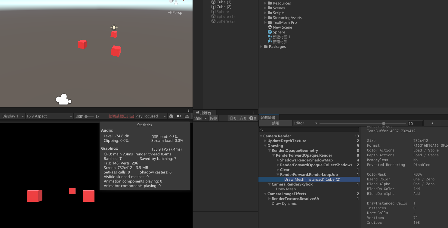 - 先失活球体,运行后可见 GPU Instancing 一次绘制了三个 Cube。