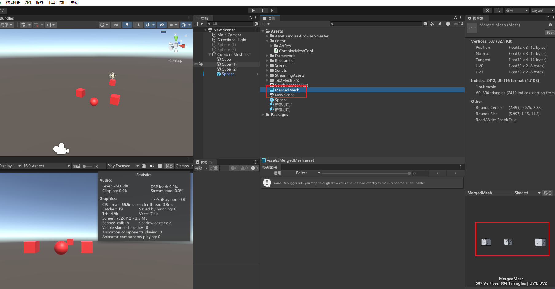 //有时候在实际开发中,我们有时可能需要在开发时就合并网格,并将其存储下来