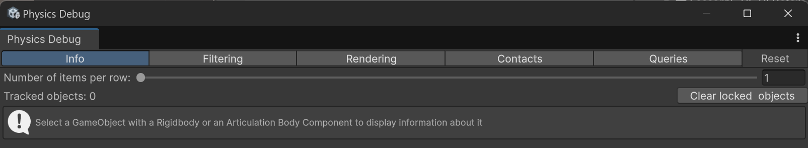 选择一个带有 Rigidbody(刚体)或 Articulation Body(关节体)组件的 GameObject,以显示它的相关信息。