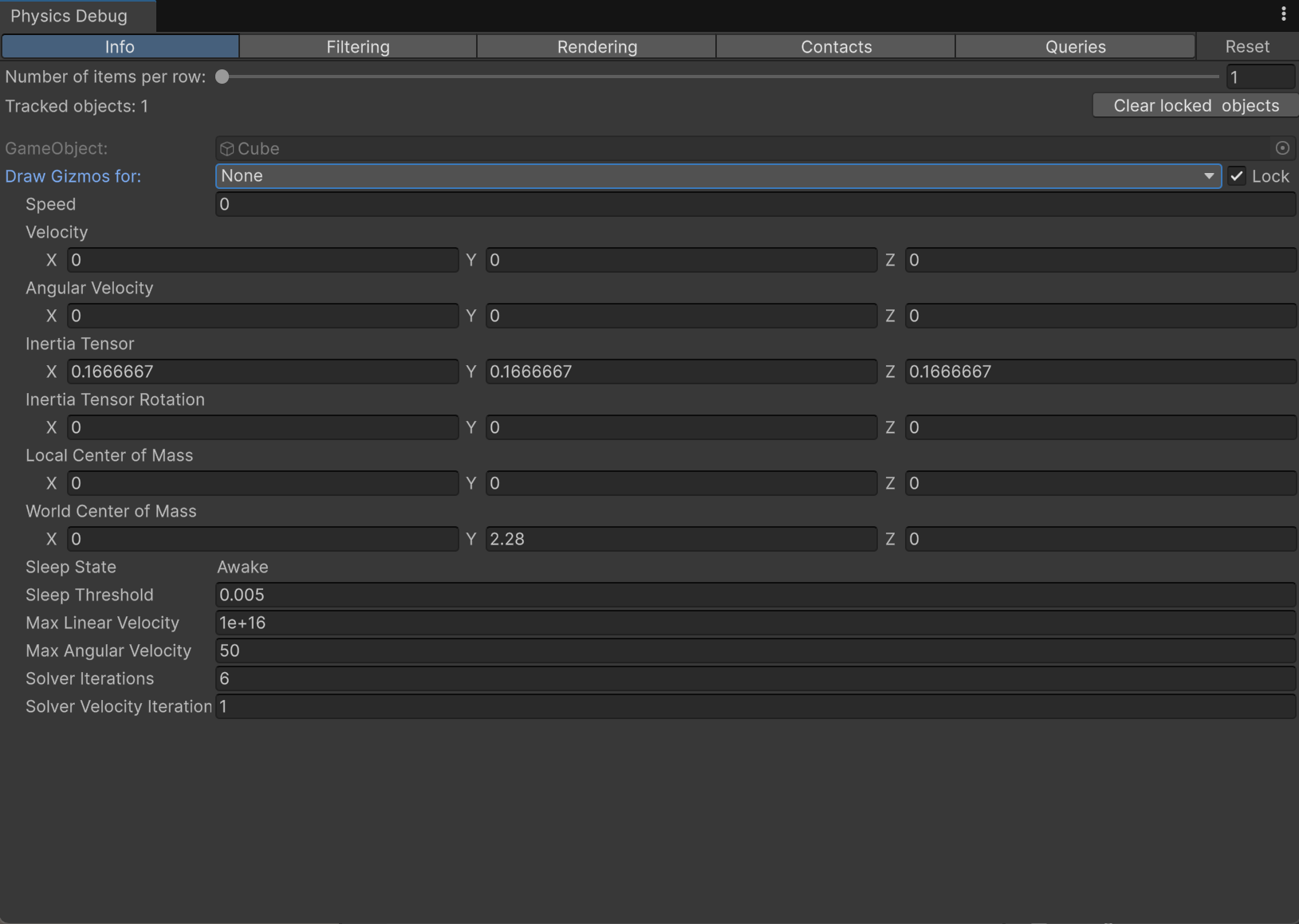 Info 页签用于显示被选中物理对象(通常是 Rigidbody)的运行时物理属性。