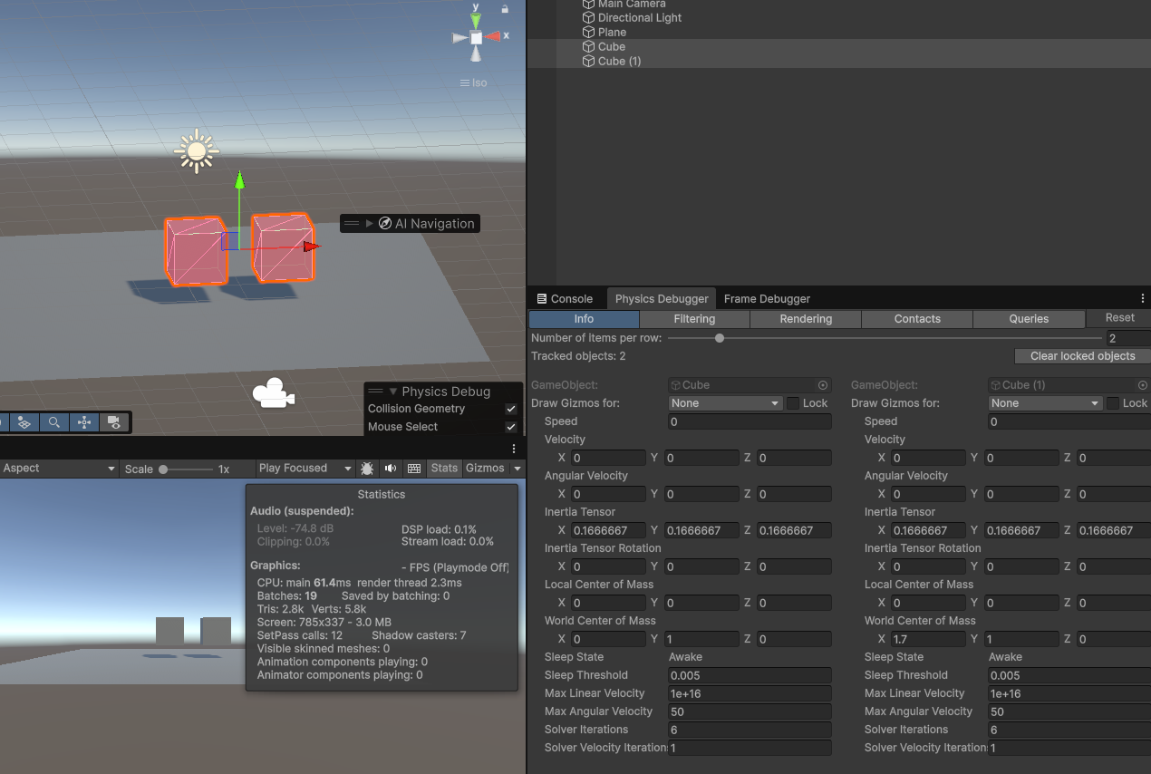 选择一个或多个带有 Rigidbody(刚体)或 Articulation Body(关节体)组件的 GameObject会显示他们的相关信息。