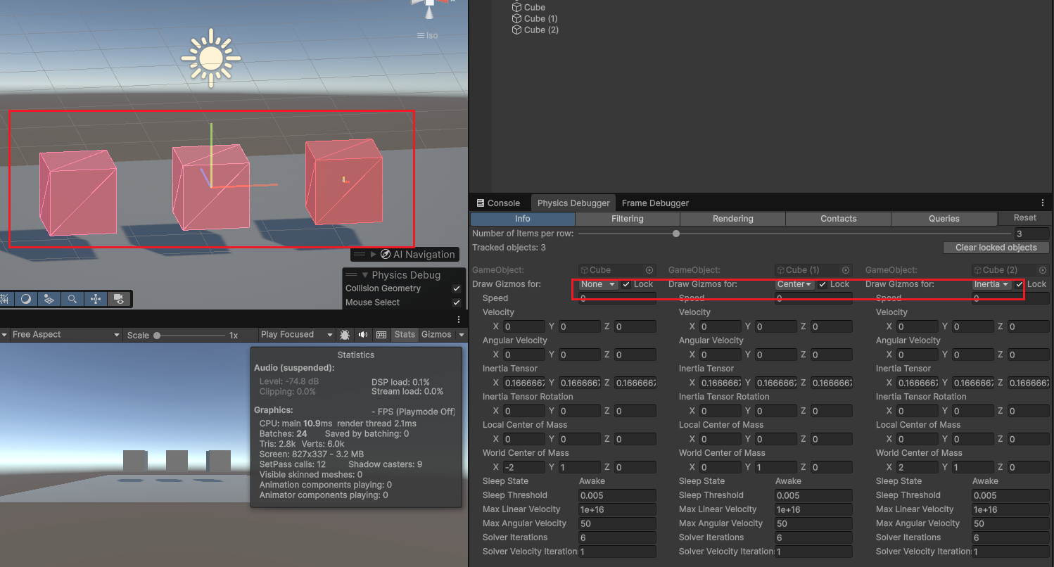 //显示被选中物理对象(通常是 Rigidbody)的运行时物理属性