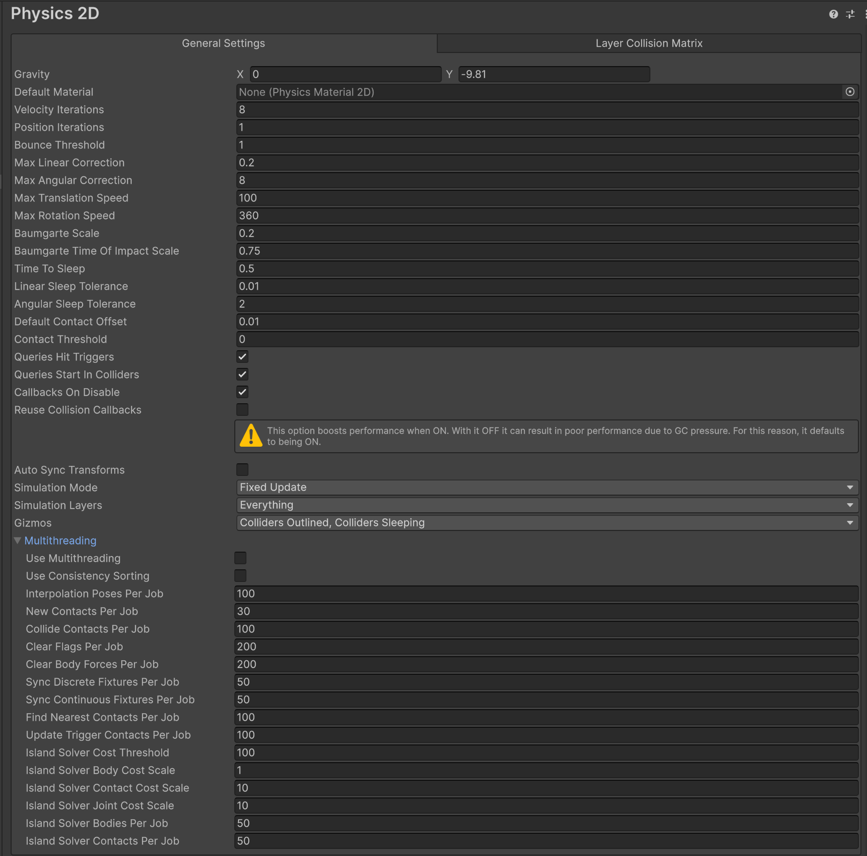 启用 2D 物理的多线程 Job 系统,物理运算会分配到多个 CPU 核心。