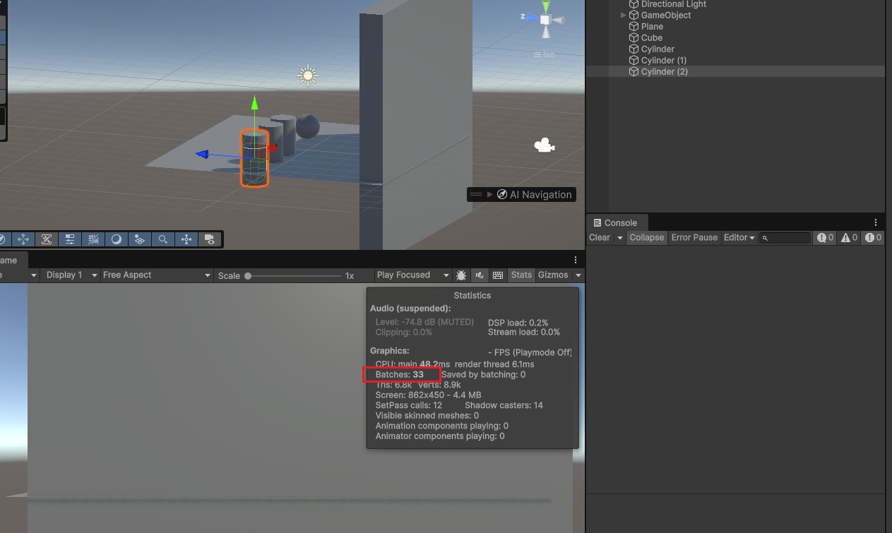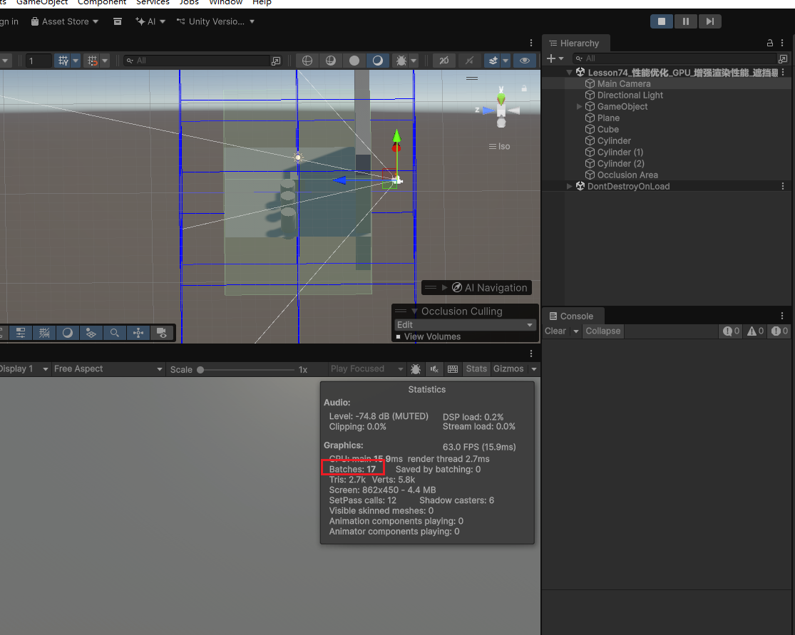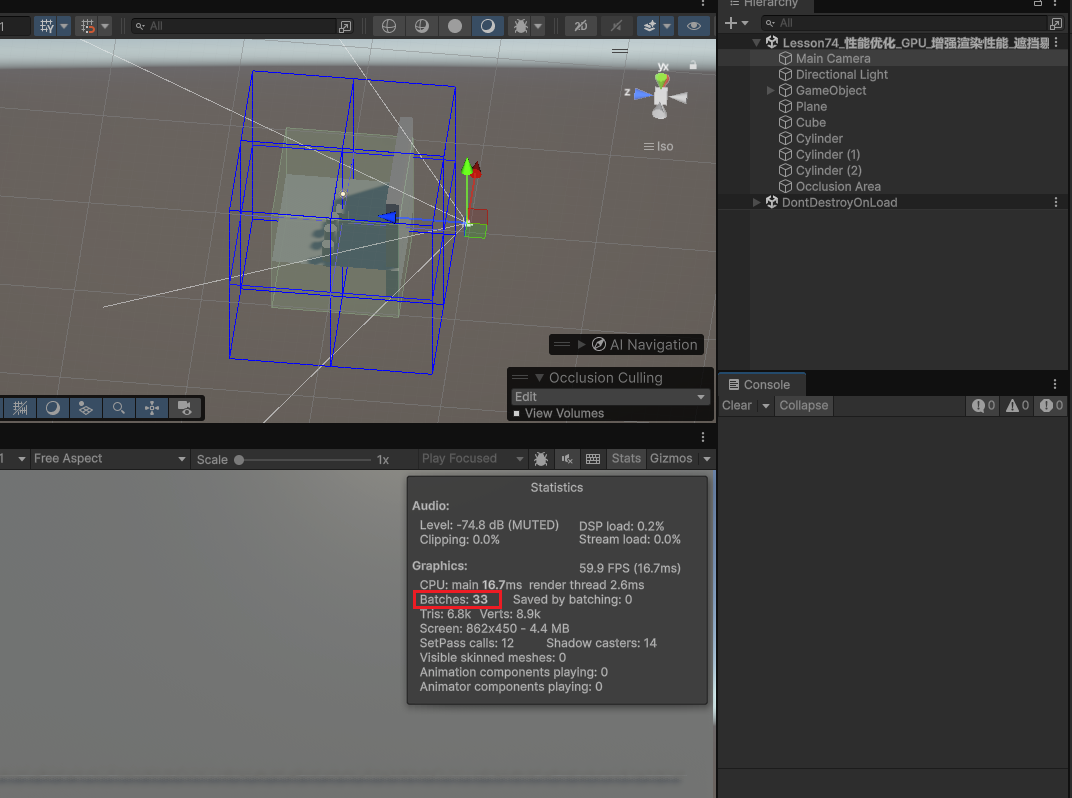 点击烘焙后发现 DrawCall 次数没有下降,可能是因为摄像机没有进入遮挡的区域。