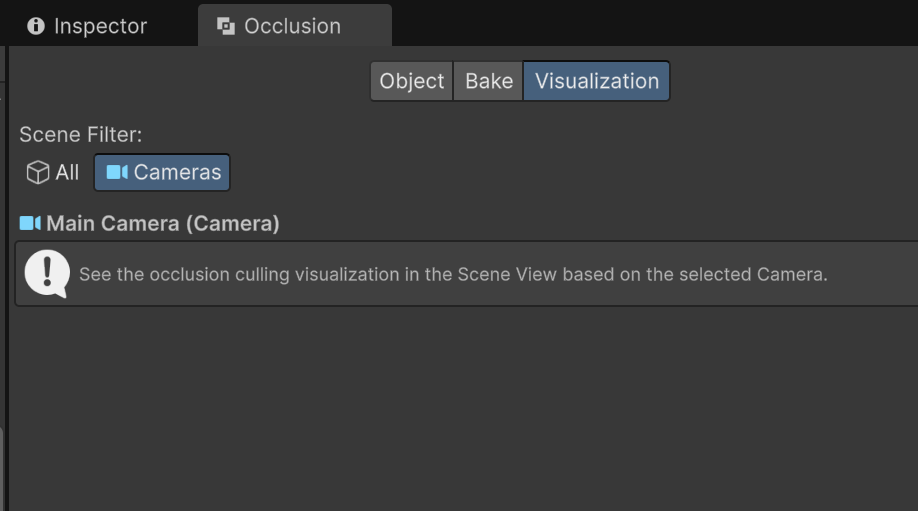当选中 Visualization(可视化)页签,再选择开启遮挡剔除的摄像机时,可以实时地看到遮挡剔除效果。