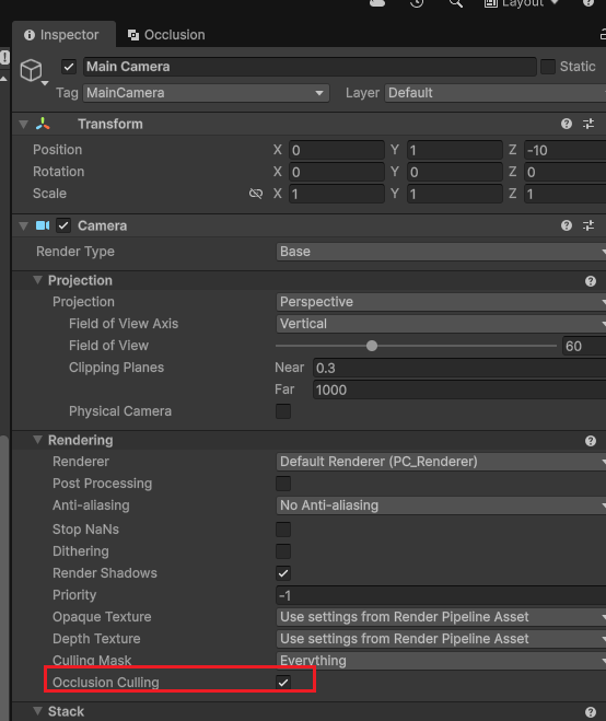 // 可能被遮挡的物体(比如角色、家具、树木等)→ 设置为 Occludee Static(静态被遮挡物)