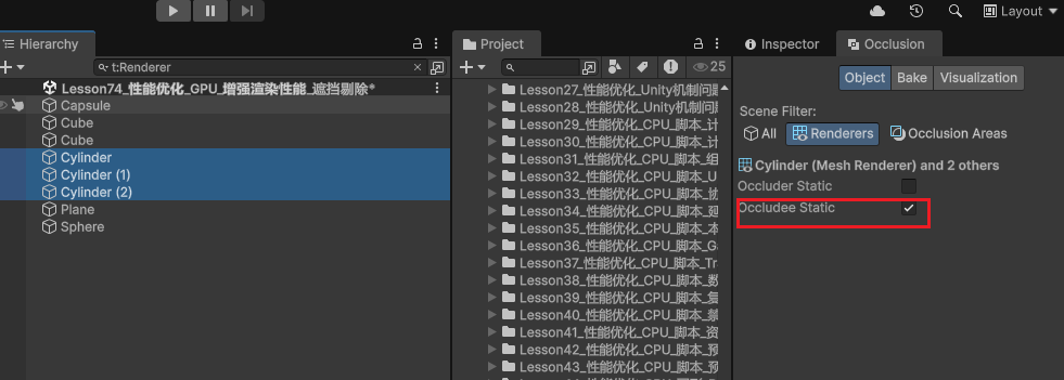 Occludee Static(静态被遮挡物)。 - 注意:动态物体不能作为静态遮挡物(