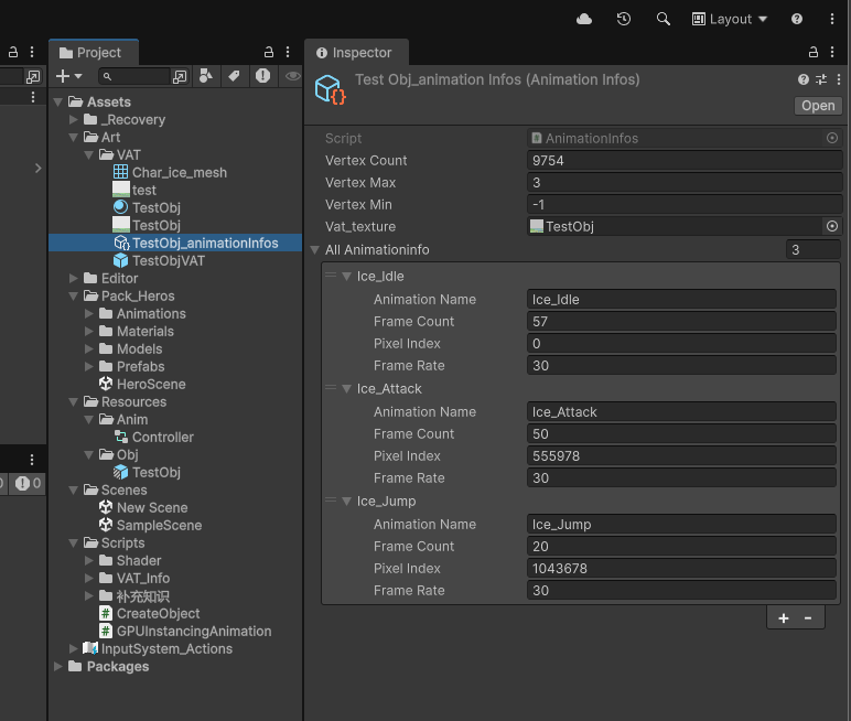 第一遍遍历所有动画、所有帧后得到全局 min / max,写入 AnimationInfos,之后在 Shader 里把 VAT 里 0~1 的数据反映射回实际坐标。