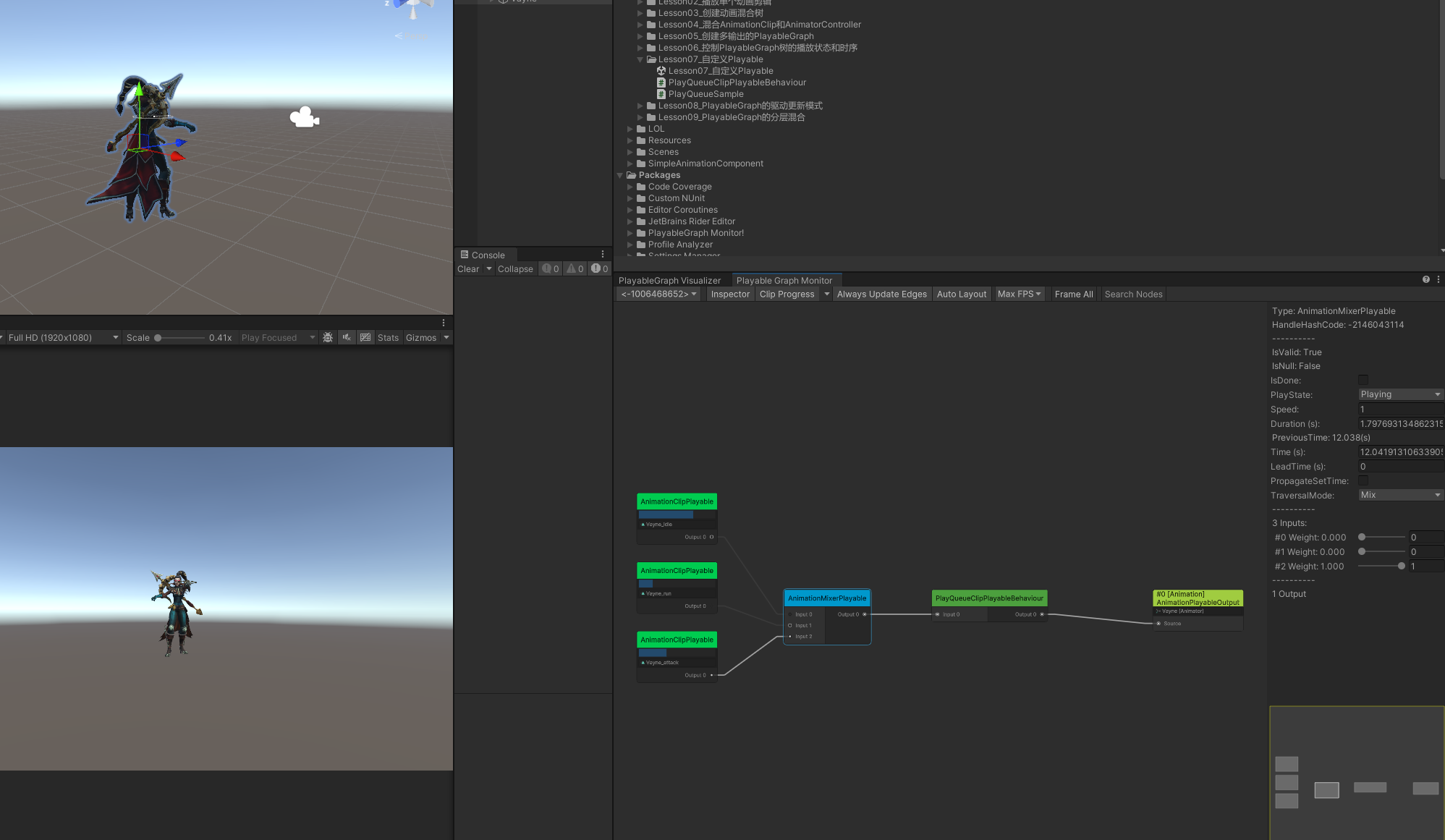 这个 Initialize() 主要做四件事:给 ScriptPlayable 开输入端口、创建 mixer、把每个 clip 接到 mixer、初始化第一个要播的 clip。