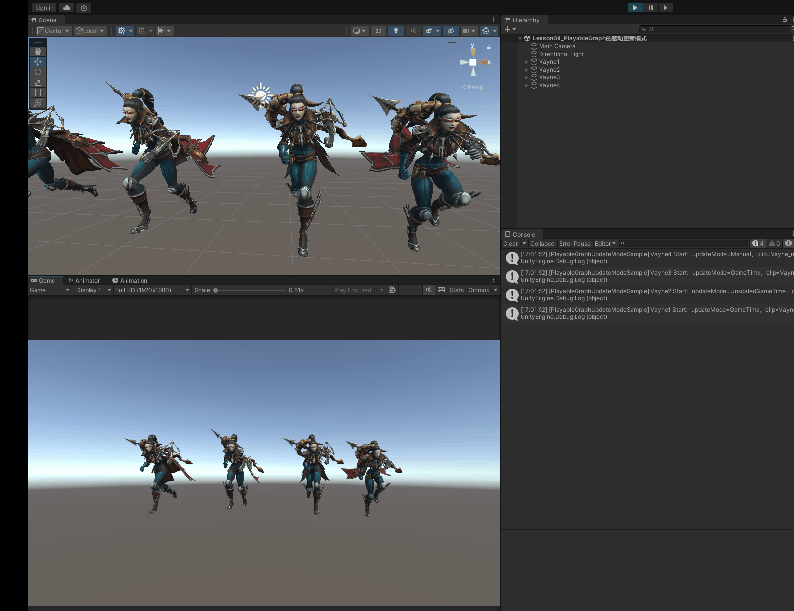 这一节用 4 个 VN(Vayne1~Vayne4)做横向对比:**同一脚本、同一动画,只改 updateMode**。进入 Play 后差异会很直观。