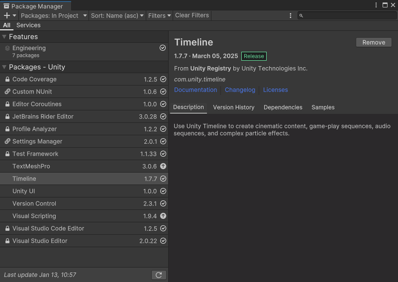Timeline(包名:com.unity.timeline),点击 Install 安装(已安装会显示 Remove,版本号如图为1.7.7)。 - 后续升级同样在 Package Manager 里完成(Version History / Update)。