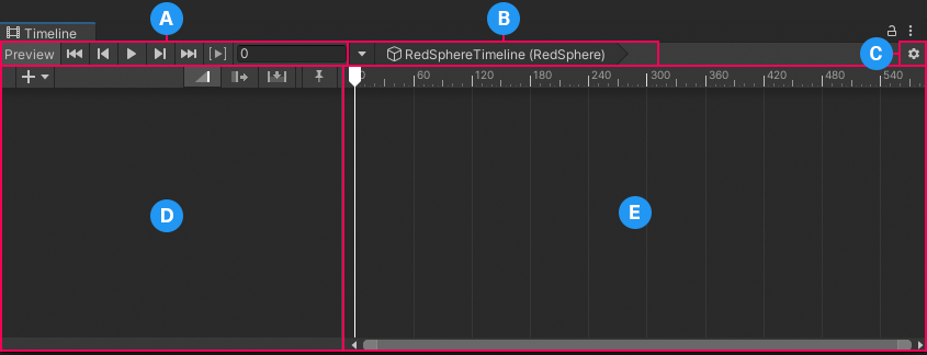 Timeline 窗口大体分 5 块(对应图里的 A~E):