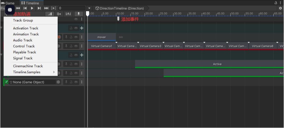 +,选Animation Track / Audio Track / Activation Track / Control Track / Signal Track ...(图里下拉菜单)。 - 放片段/事件:把 Clip 拖进时间轴,或在轨道上右键添加 Clip/Marker(不同轨道支持的内容不一样)。