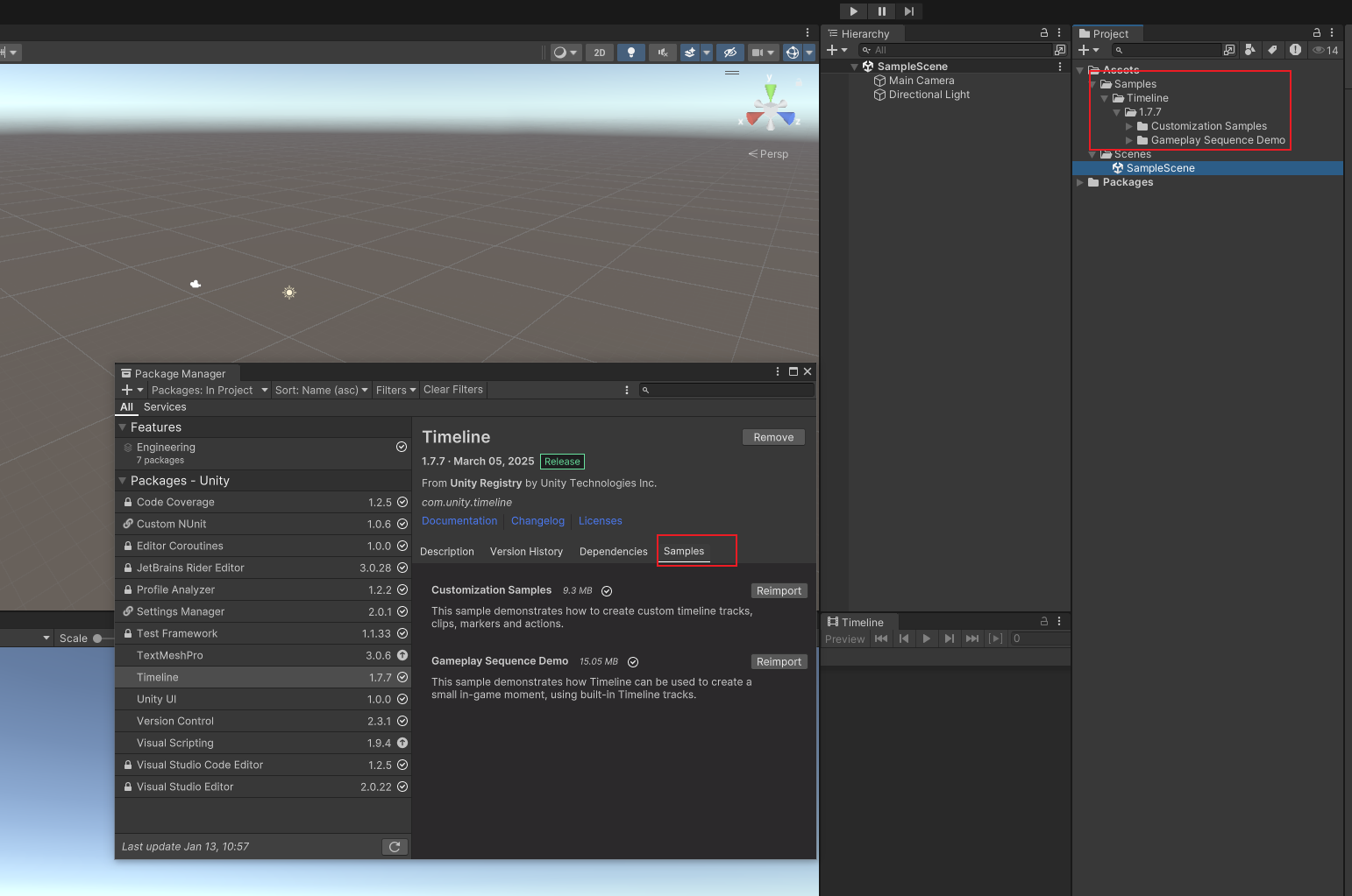 Assets/Samples/Timeline/1.7.7/(例如Customization Samples、Gameplay Sequence Demo)。