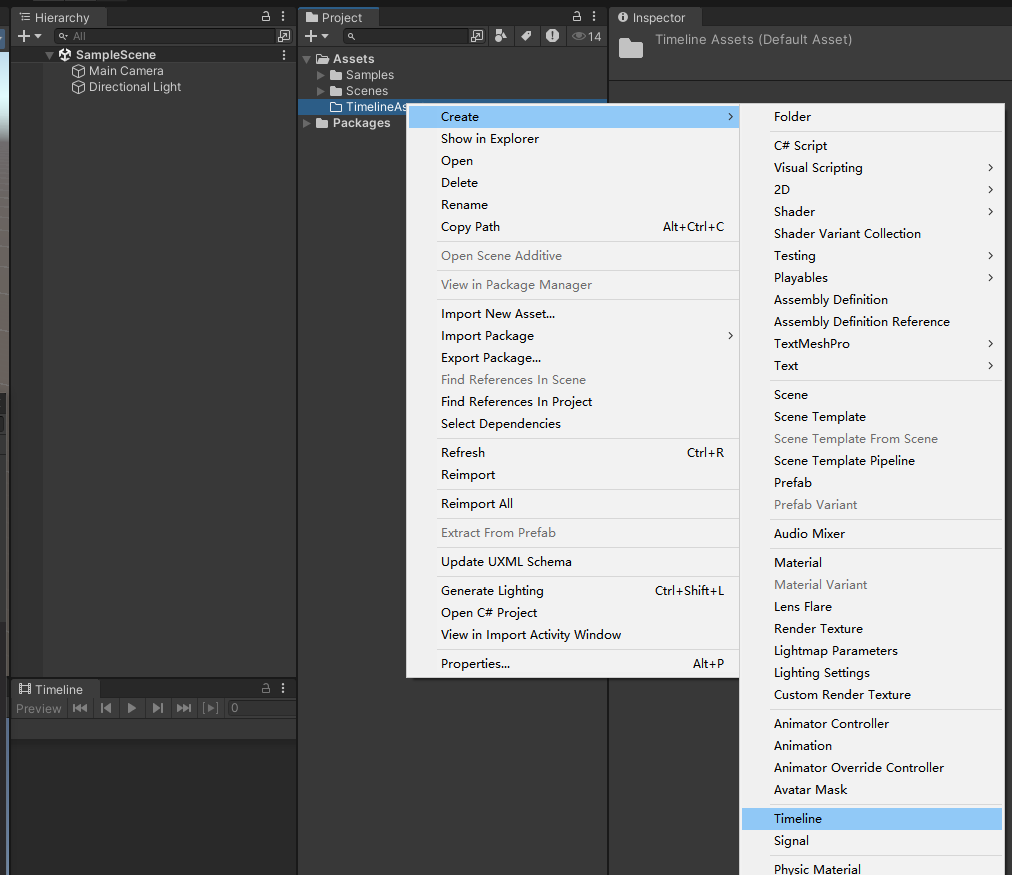 方式2:Timeline 窗口创建(自动挂 Director 并绑定资源)
