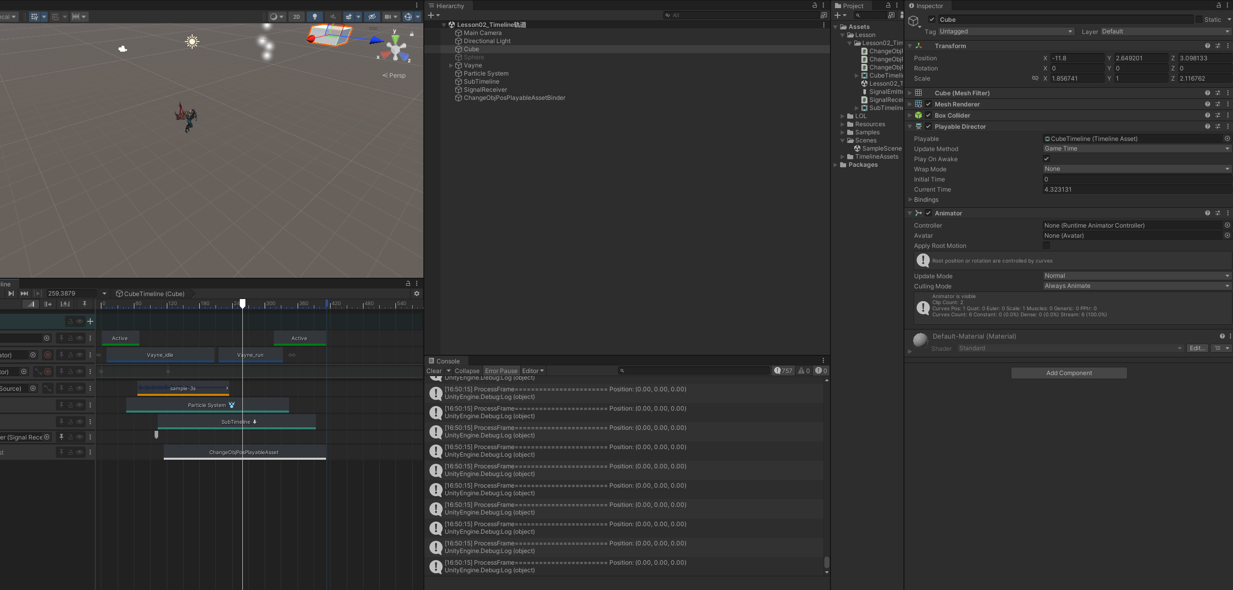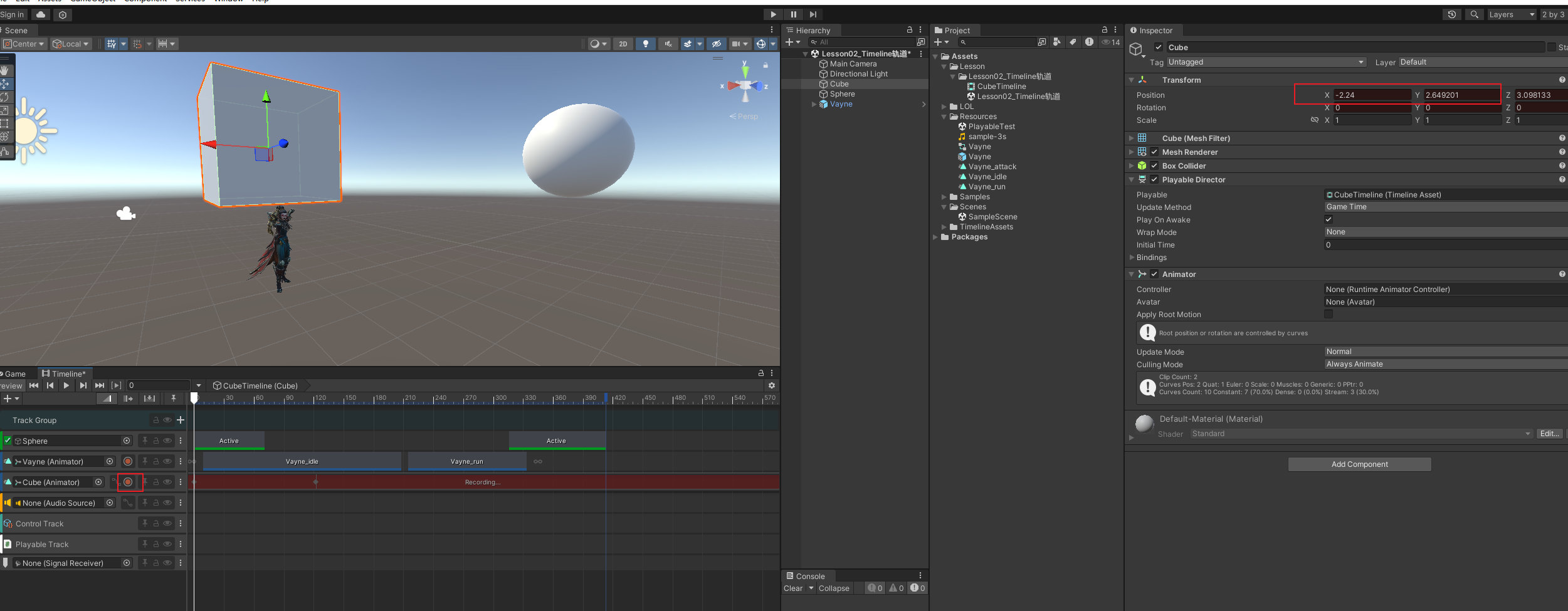 Recording...) - 这时在 Scene 里改 Transform(位置/旋转/缩放),Timeline 会在当前时间点打关键帧