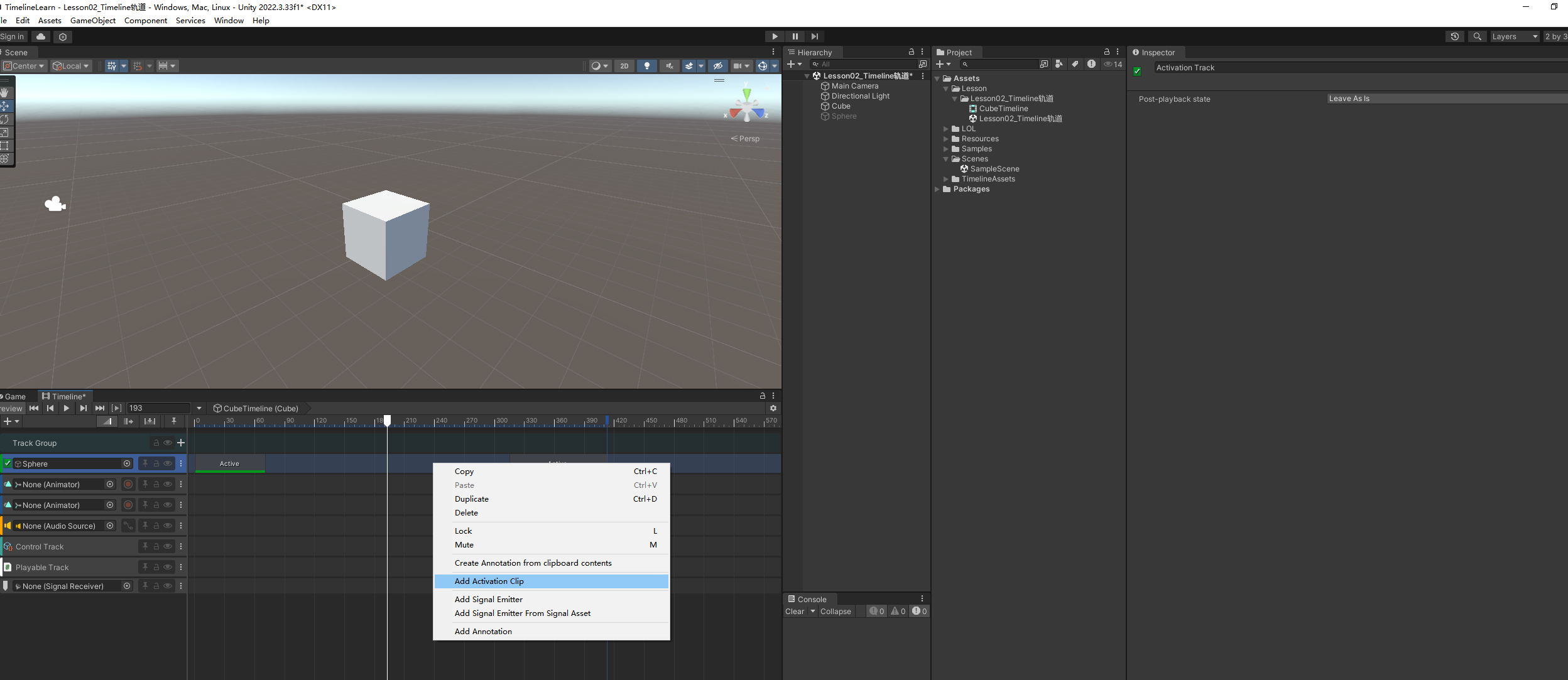 Activation Track 用来控制 GameObject 的激活/禁用(本质是 SetActive(true/false) )。