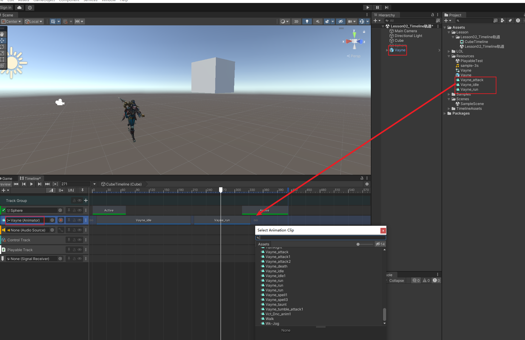 Animator)拖到轨道左侧的绑定槽(示例里显示Vayne (Animator)) - 往右侧时间轴里放动画:直接拖
