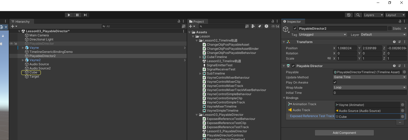 ExposedReferenceTestTrack的 Binding 类型声明为GameObject,所以ProcessFrame(..., object playerData)里拿到的就是这个绑定对象。- Director 的 Bindings 面板里把该轨道绑定到